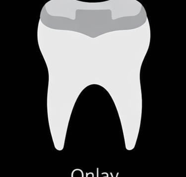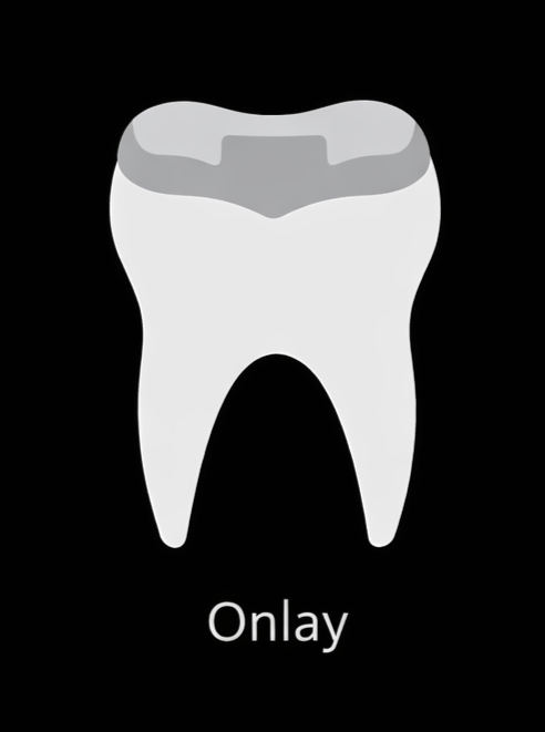 An onlay or overlay is a larger custom-made restoration that covers one or more cusps (or most of the biting surface) of a tooth, used when damage is too extensive for a filling but the full coverage of a crown is not required.